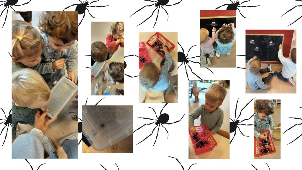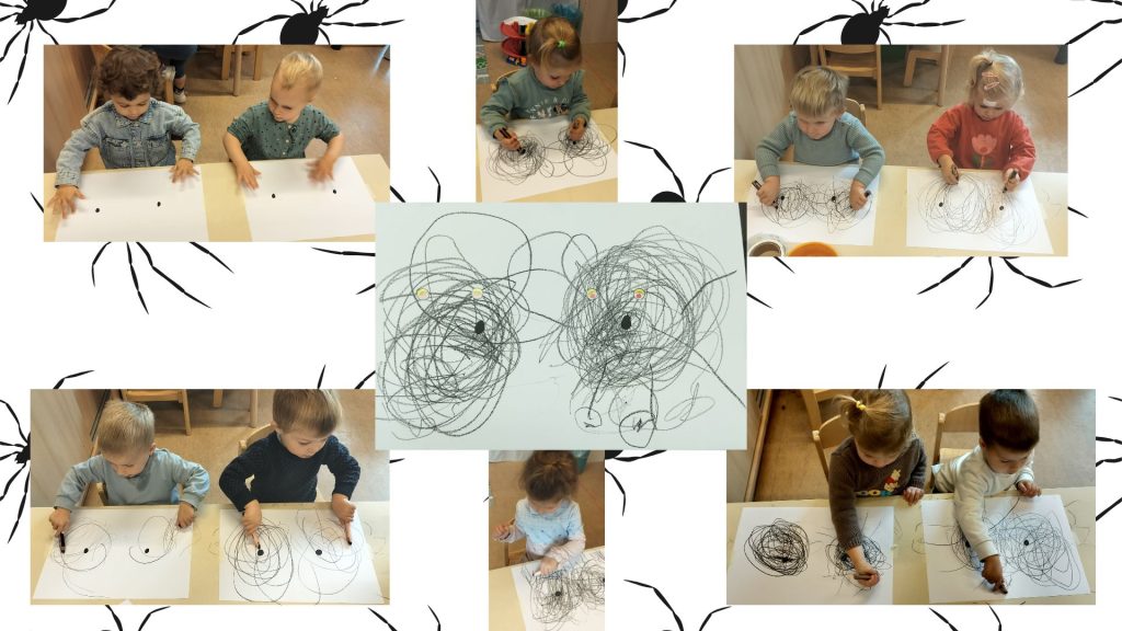 We deden voor het eerst dit schooljaar Krullenbol, bewegen en schrijven op muziek. We oefenden eerst met onze armen in de lucht, daarna met onze vingers op papier, om als laatste de potloden te nemen en onze spinnen te tekenen. Eindresultaat: 2 grote spinnen met hele lange poten. We mochten ook aan het krijtbord de spinnen poten geven en ook zelf spinnen vangen met de pincetten.