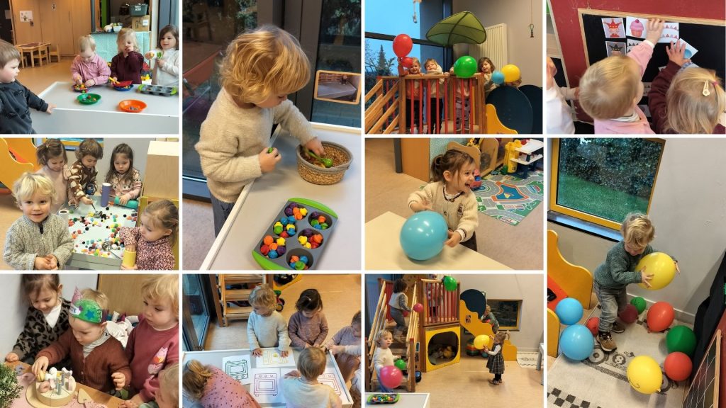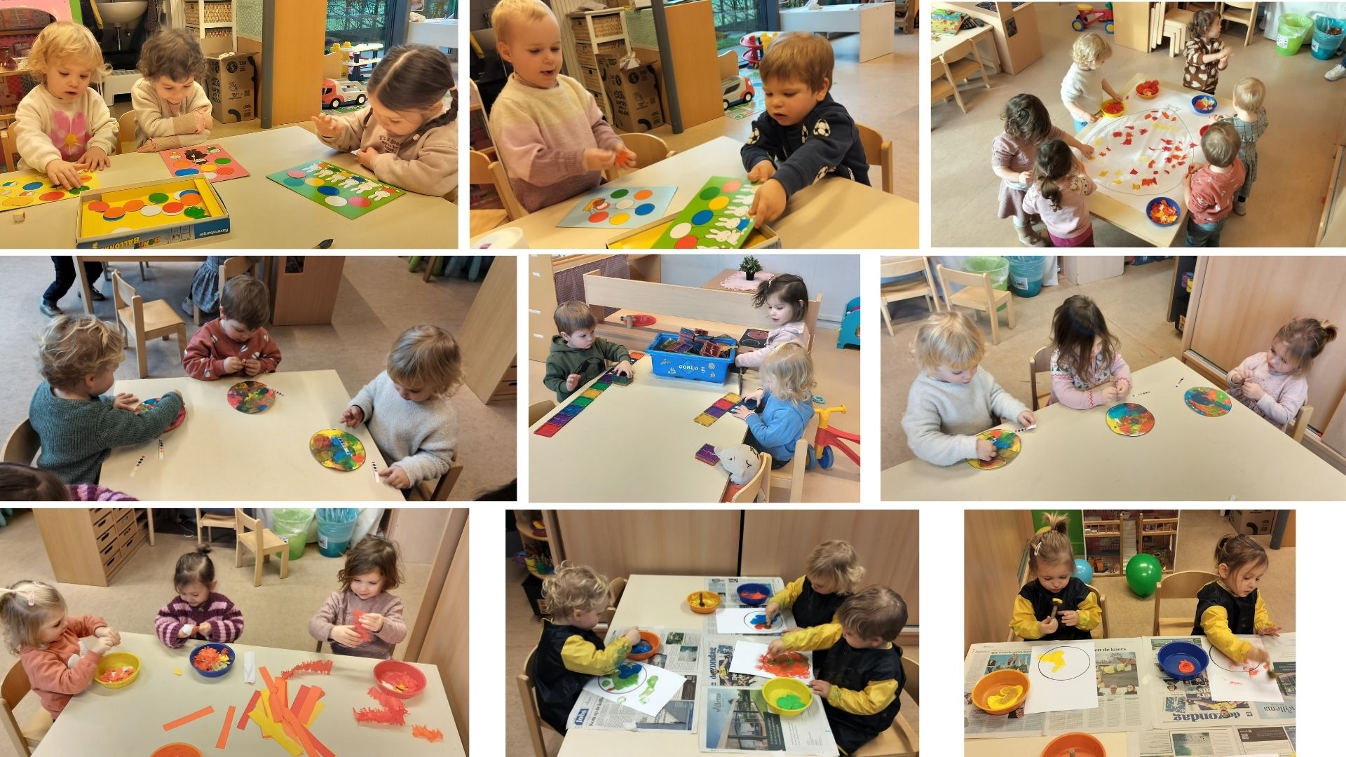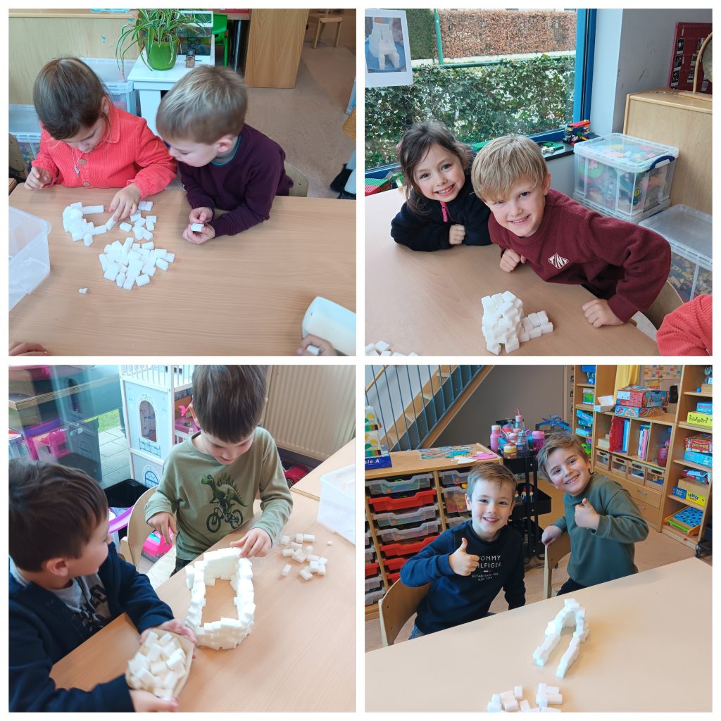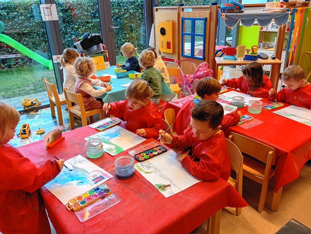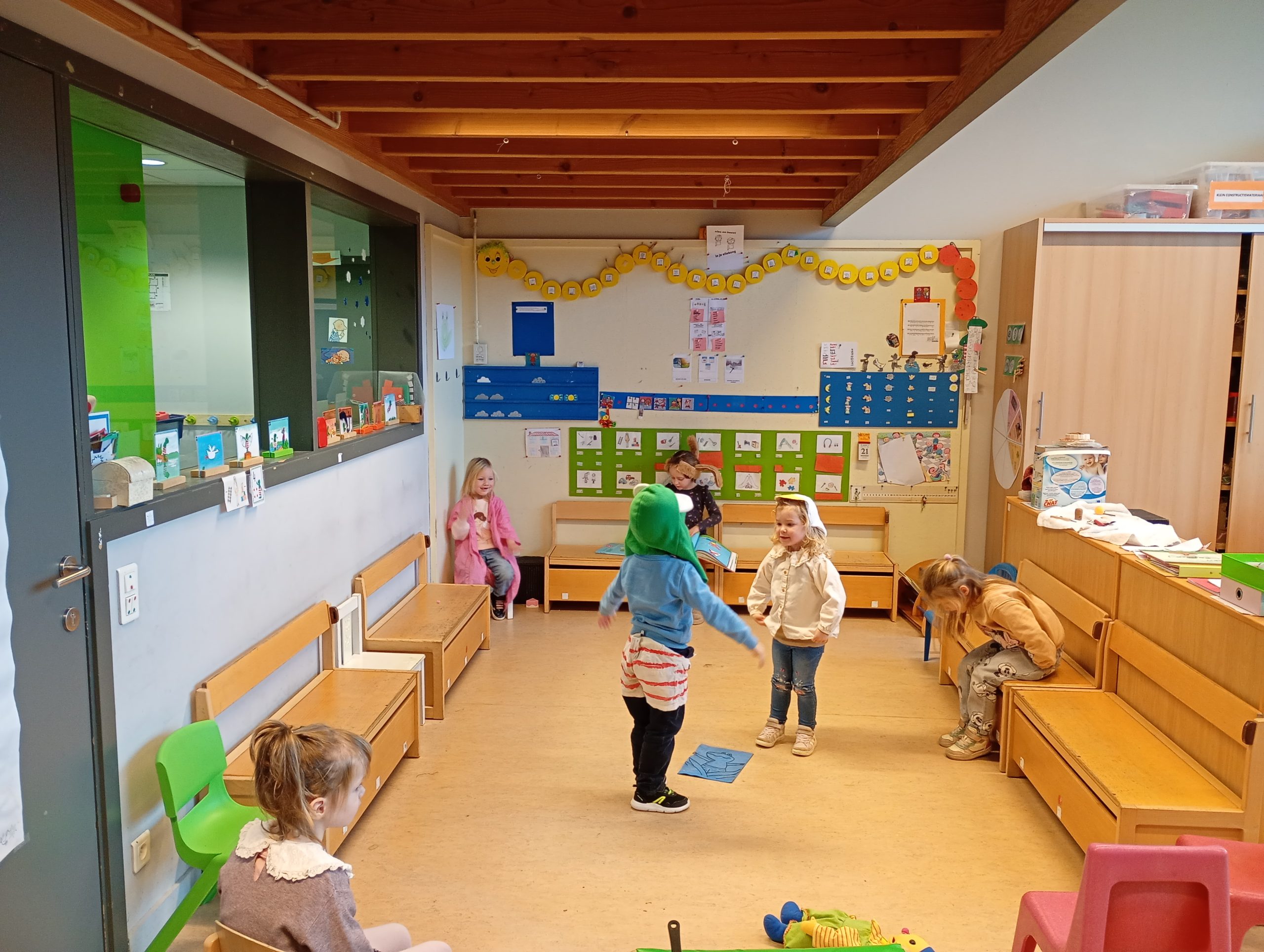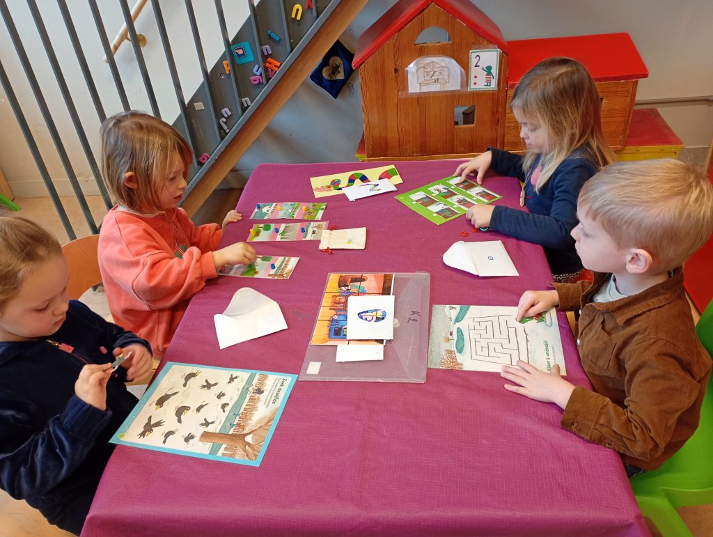 In de tweede kleuterklas werkten we drie weken lang rond de figuren van kikker en zijn vriendjes uit de verhalen van Max Velthuys. Ziehier enkele activiteiten: verhaal naspelen, fragmenten uit een verhaal naschilderen en een aanbod gerichte individuele opdrachten.