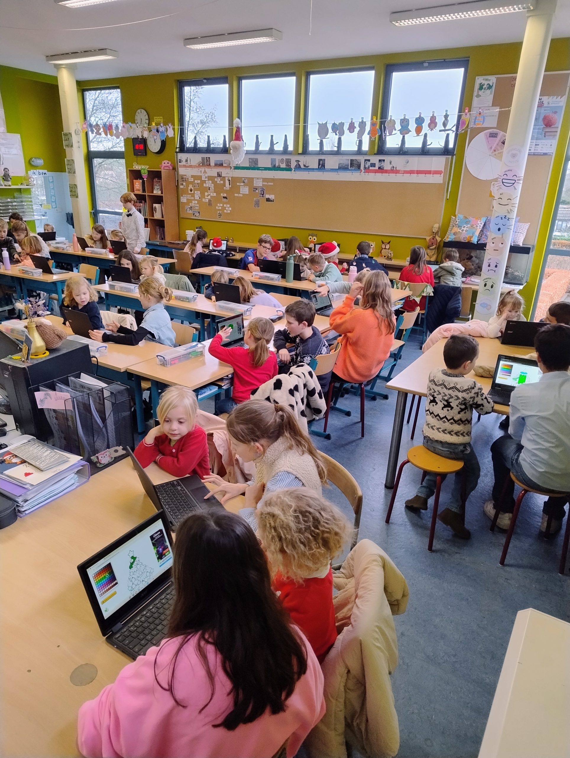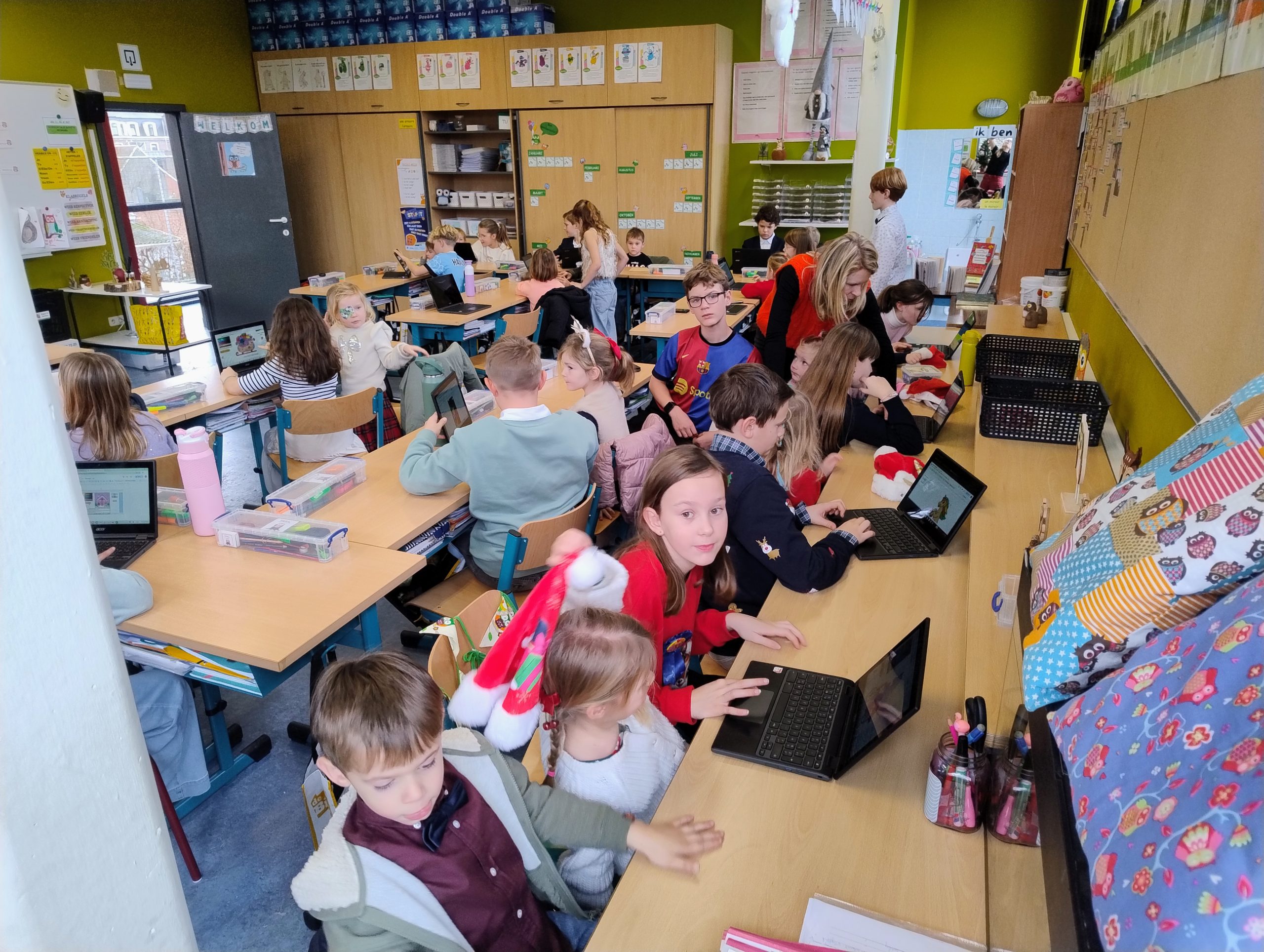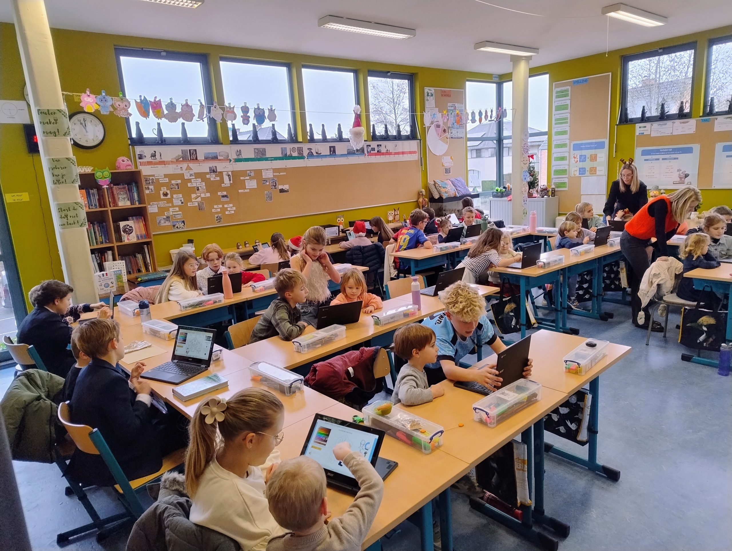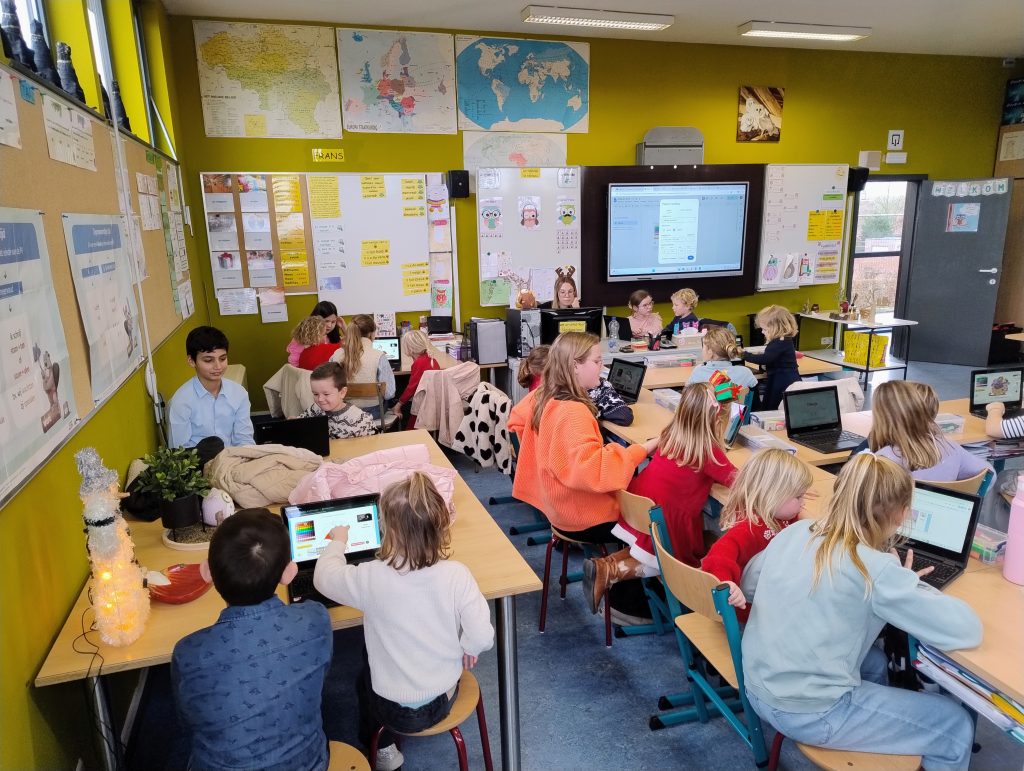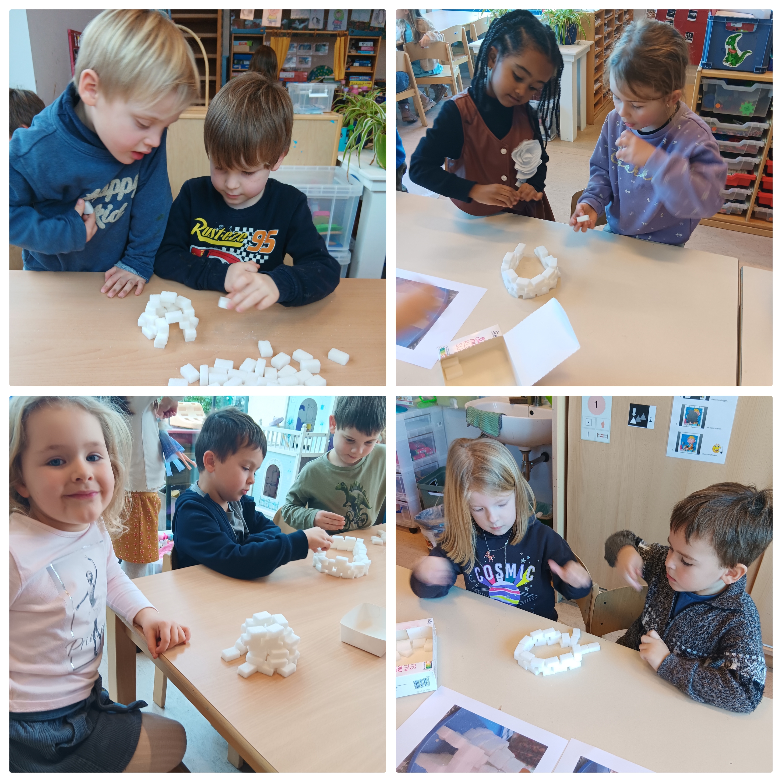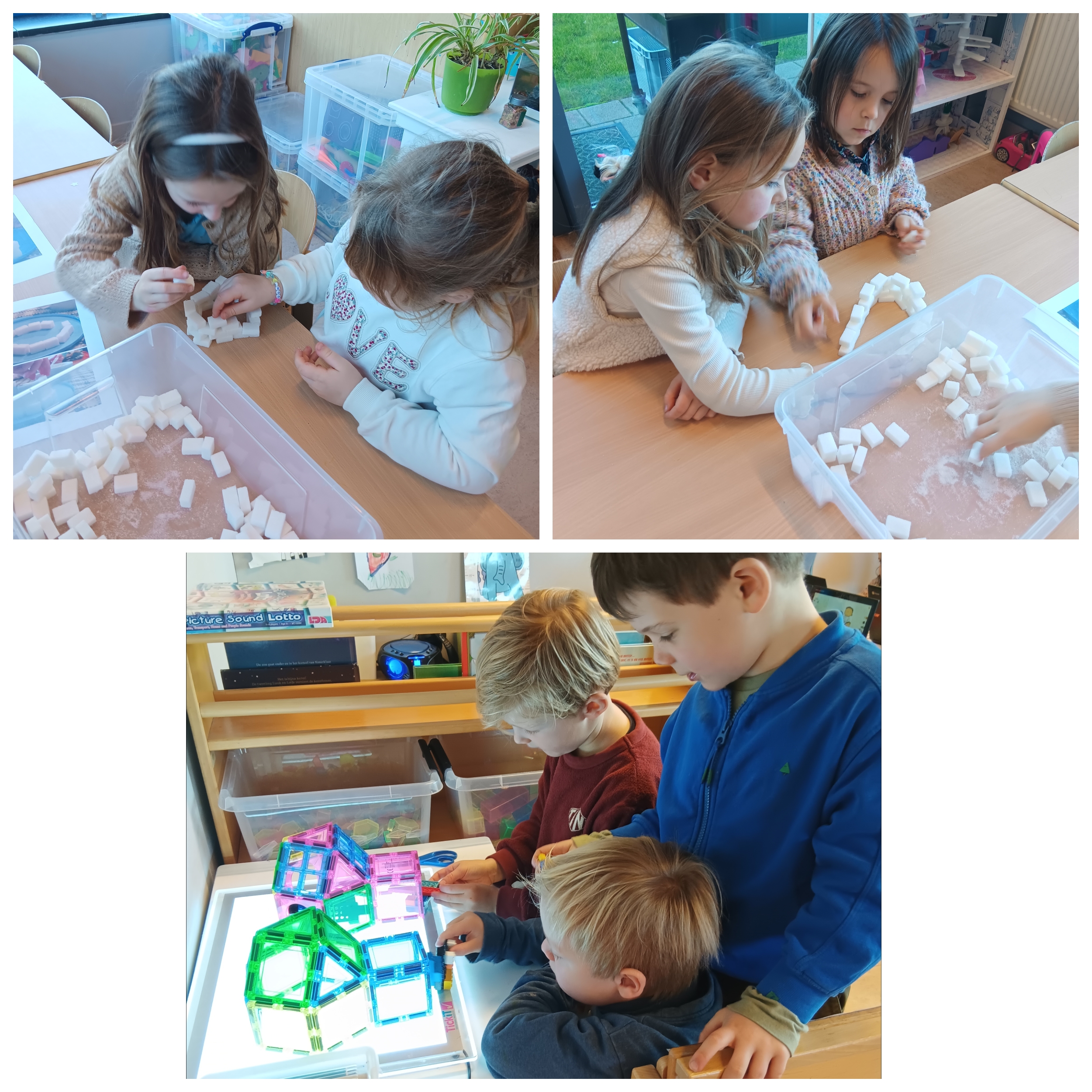 In de tweede kleuterklas werkten we drie weken lang rond de figuren van kikker en zijn vriendjes uit de verhalen van Max Velthuys. Ziehier enkele activiteiten: verhaal naspelen, fragmenten uit een verhaal naschilderen en een aanbod gerichte individuele opdrachten.
