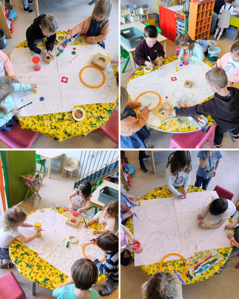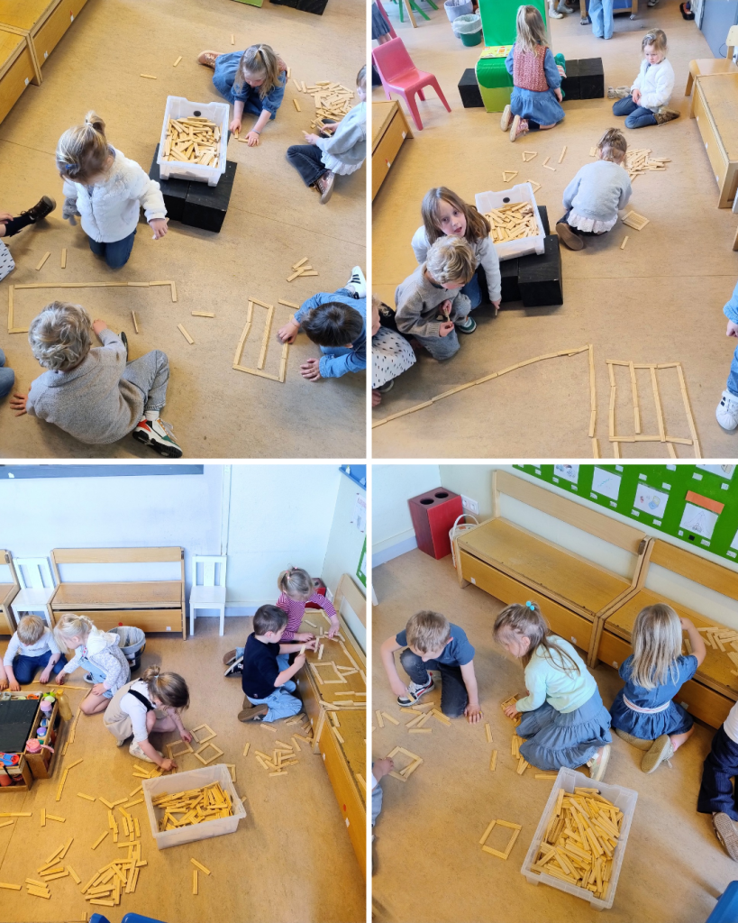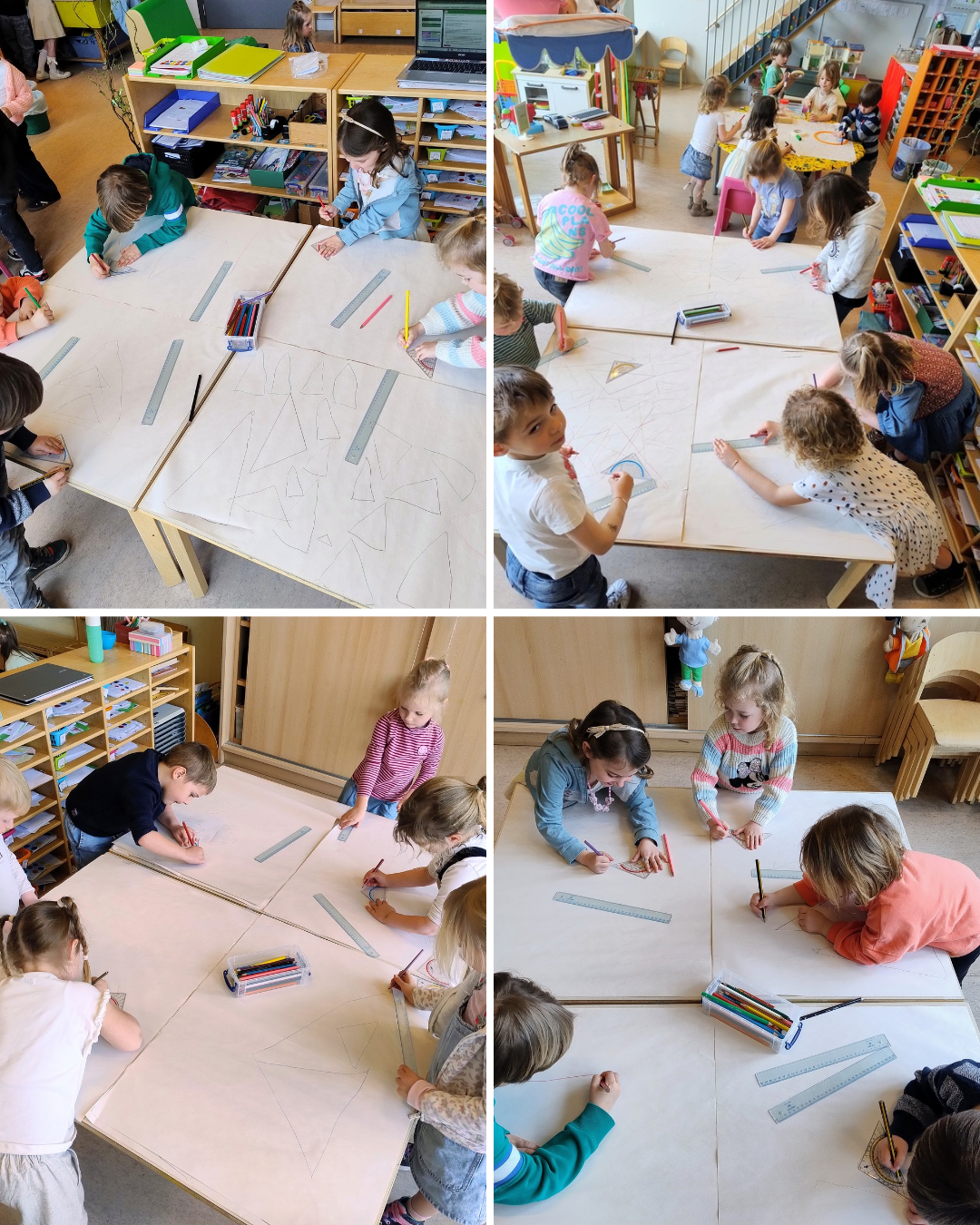 De tweede kleuterklas leerde al over hun thema op veel verschillende manieren: vormen en kleuren voelen, ze sorteren in een matrix, ze uitknippen, er over zingen.. Vandaag gingen we aan het werk om ze zelf te maken: Hoe gebruiken we een meetlat? Hoe maken we een driehoek? Hoe maken we een cirkel helemaal rond? Hoe maken we een vierkant met 4 dezelfde zijdes? In een doorschuifsysteem gingen we met de verschillende oefeningen aan het werk.