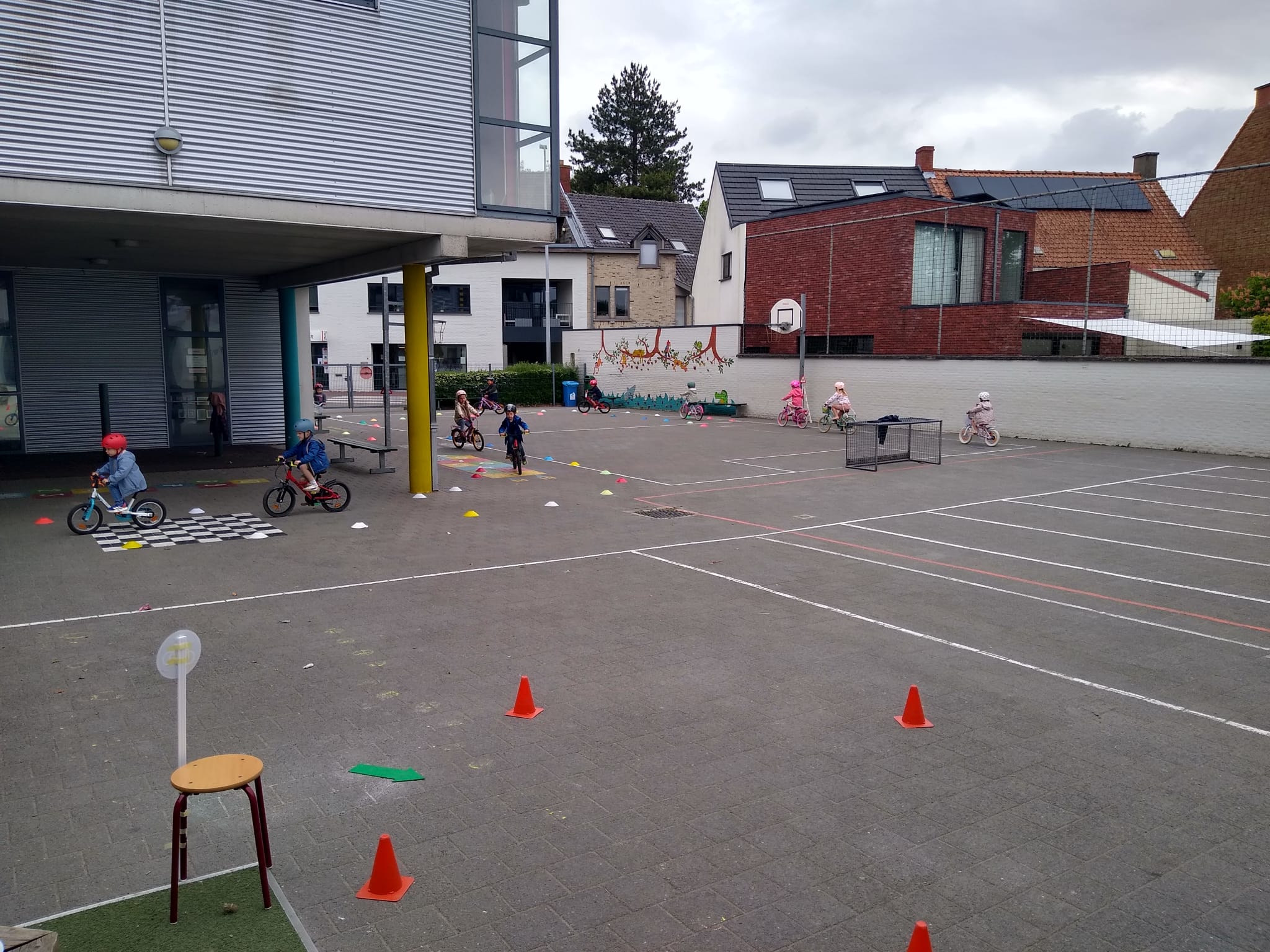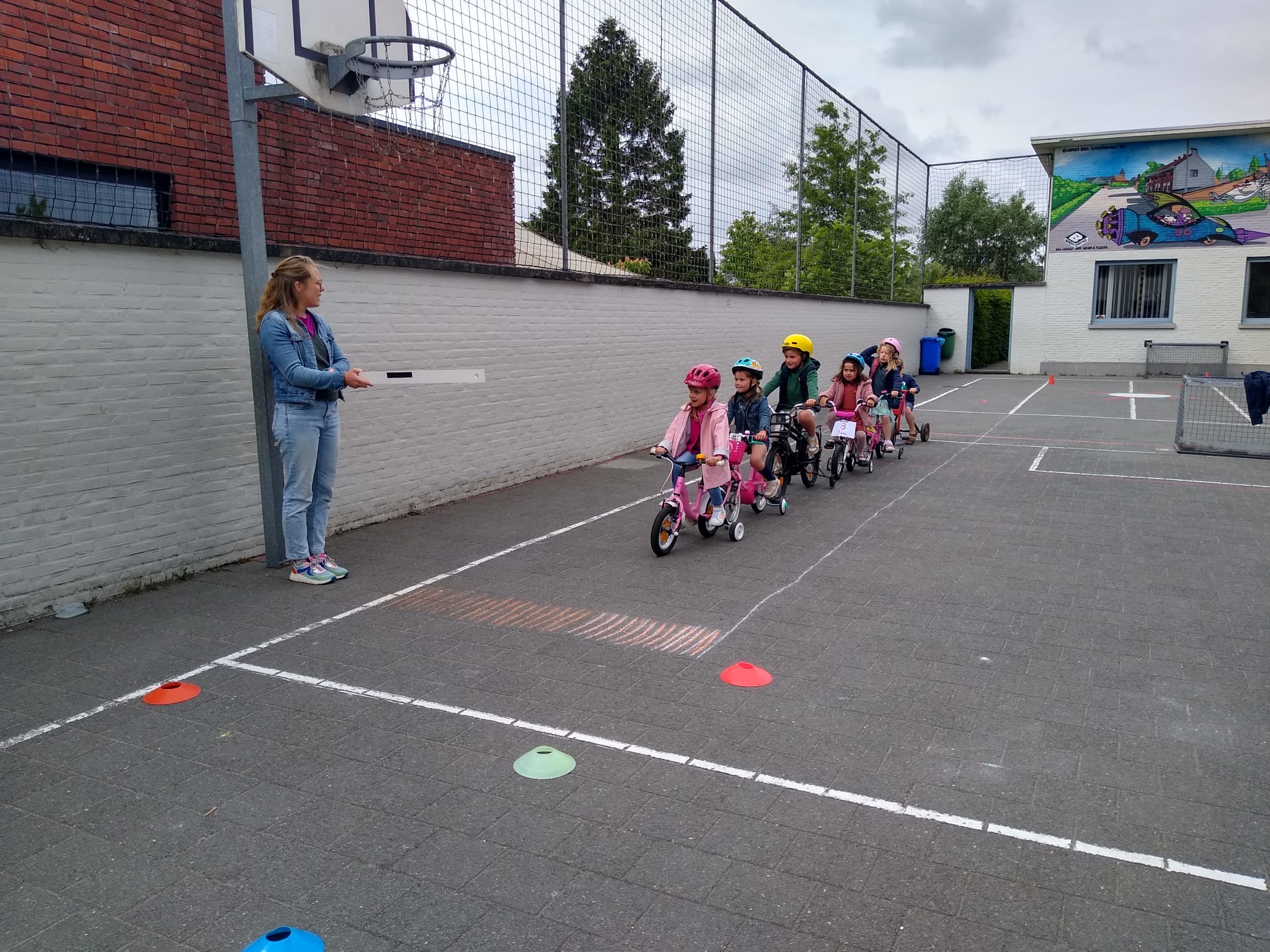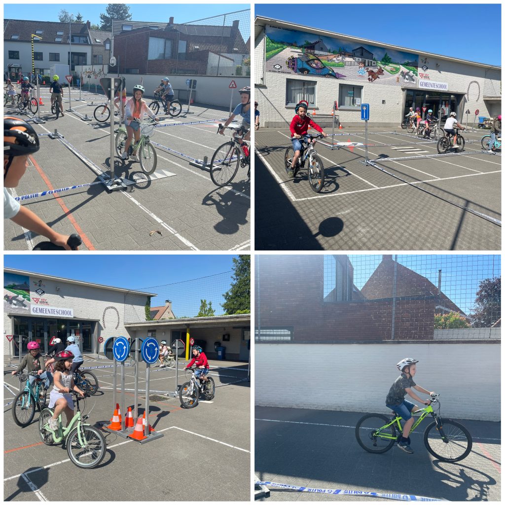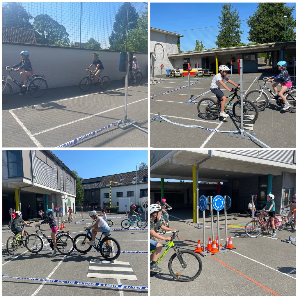 Ook de leerlingen van het vierde leerjaar verkenden het fietsparcours op onze speelplaats. Na een korte uitleg over de verkeersborden en voorrangsregels, oefenden we onze fietsvaardigheid. Fietsen én tegelijk op alle verkeersborden en -regels letten, is toch minder gemakkelijk dan het lijkt.