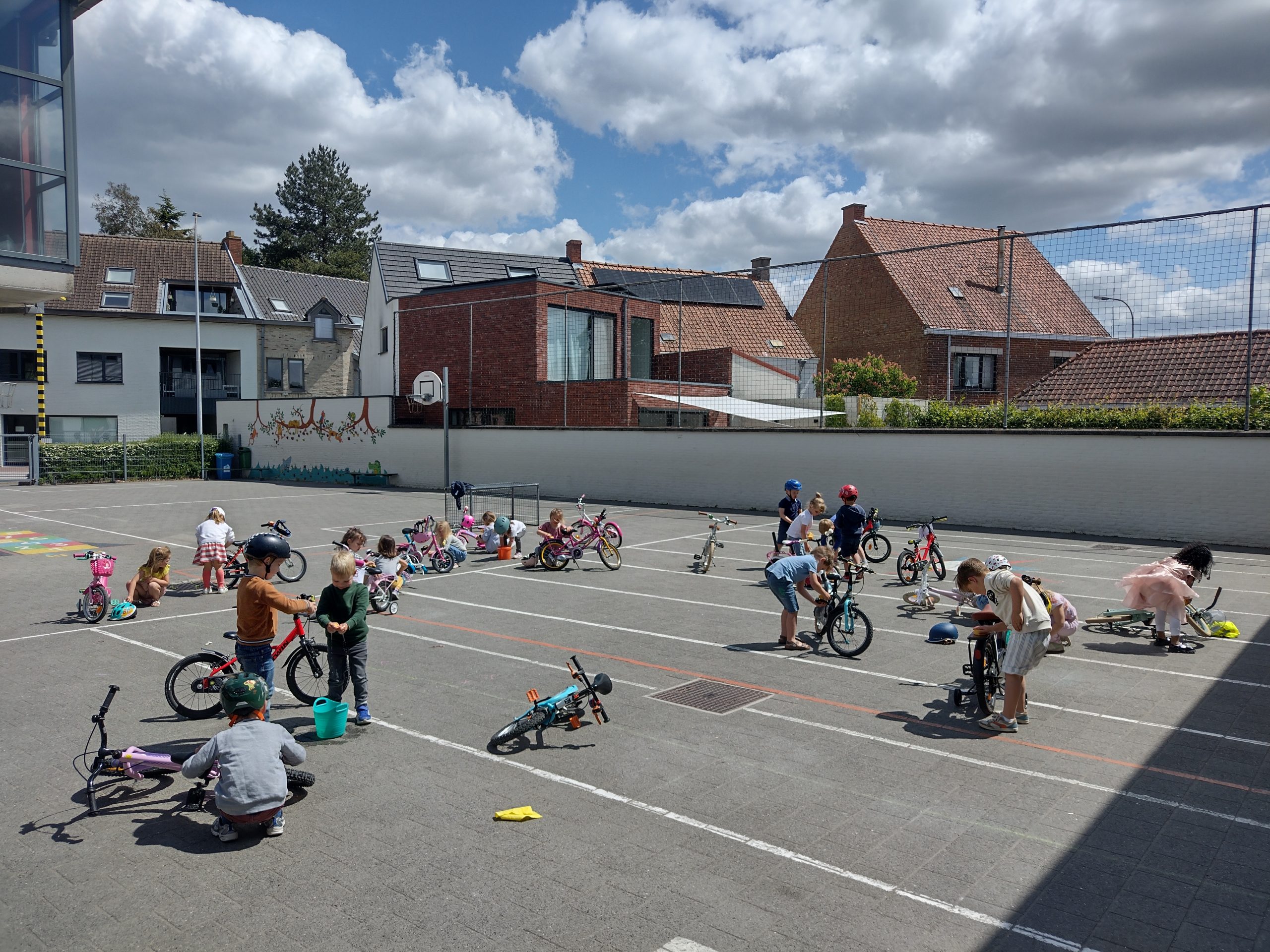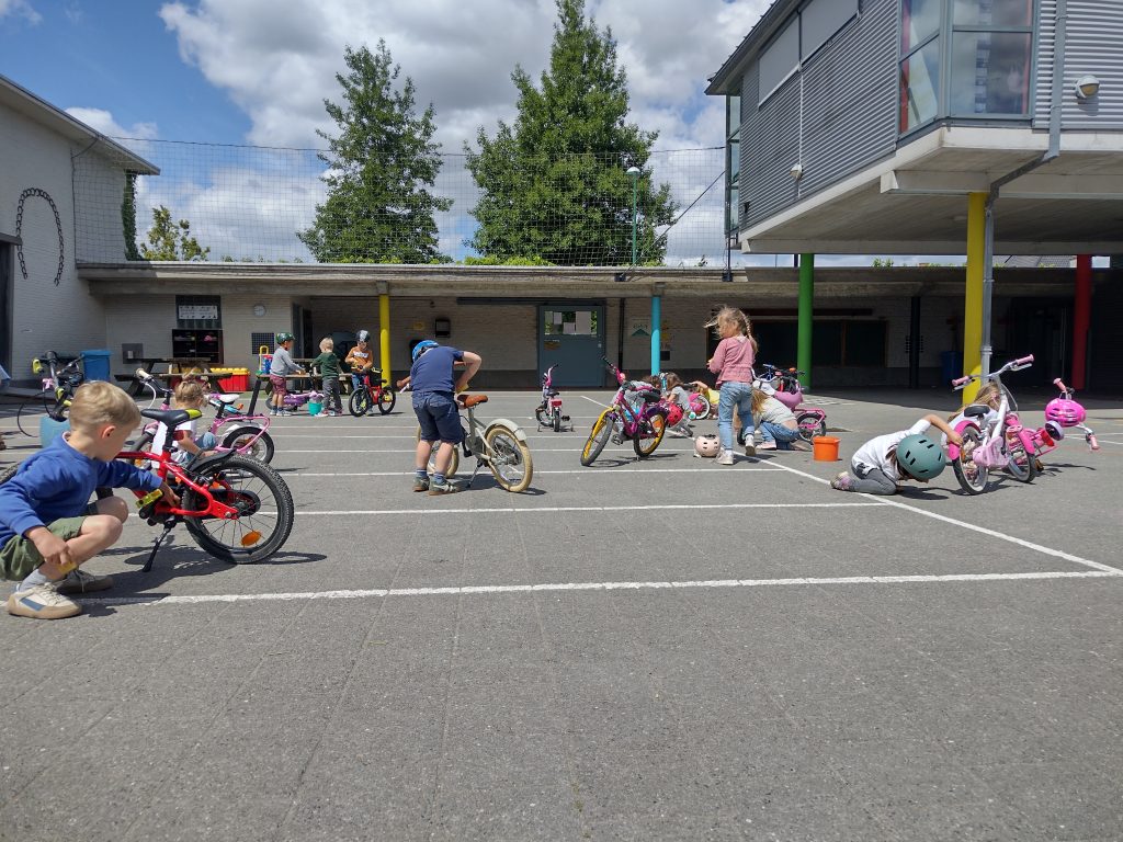 Met de fiets naar school, ook voor de 2de kleuterklas een groot plezier! Onze fiets-tweedaagse begon met een groot parcours op de speelplaats van het lager, we leerden draaien, remmen, samen rijden, stoppen voor de ’trein’, … Ook in de namiddag kreeg iedereen opnieuw de kans om verder te fietsen. Op vrijdagnamiddag deden we ook iets anders: onze fietsen wassen, nog extra reflectoren er op en de ketting gesmeerd! Helemaal klaar om naar huis te fietsen 😉