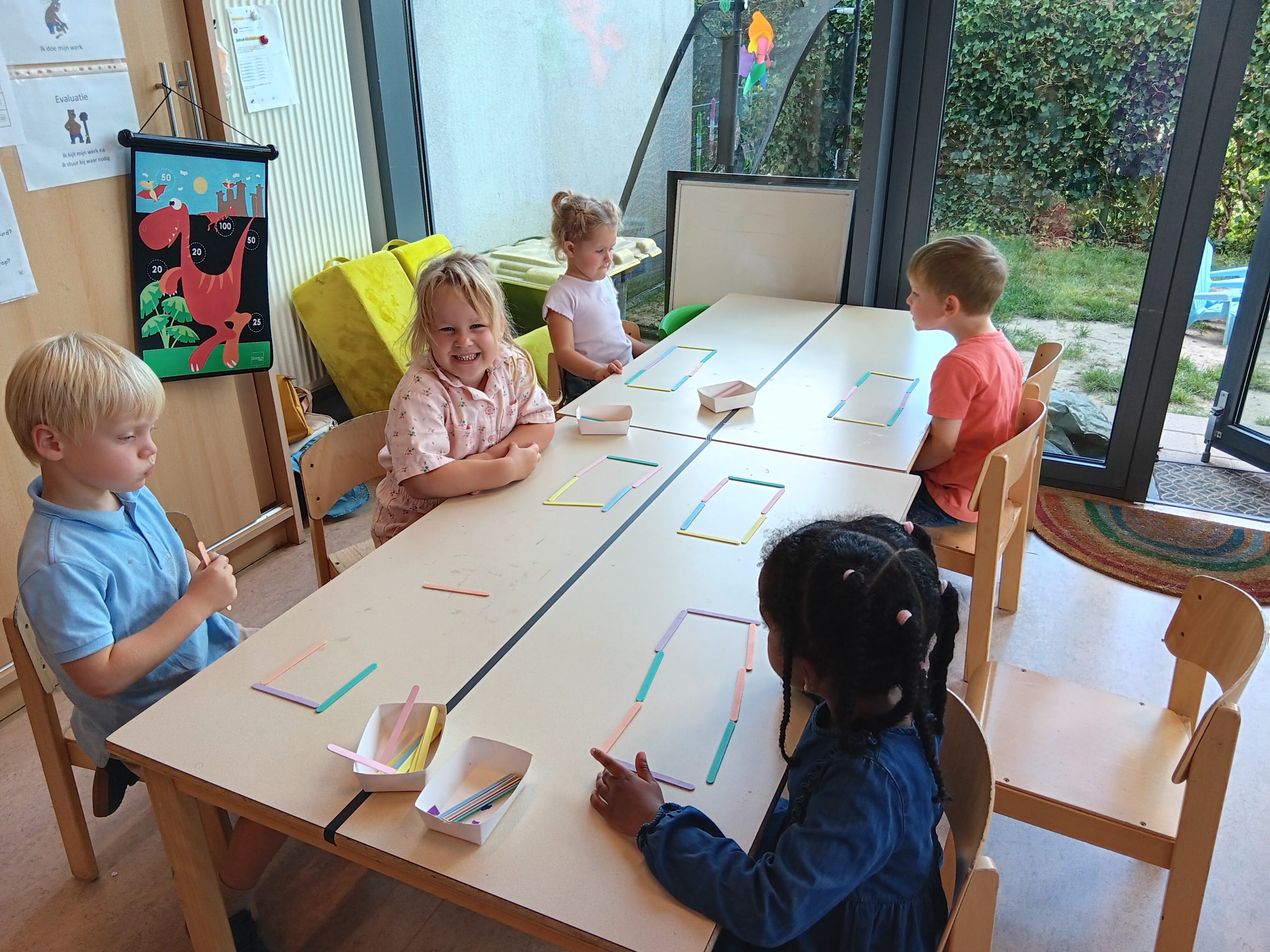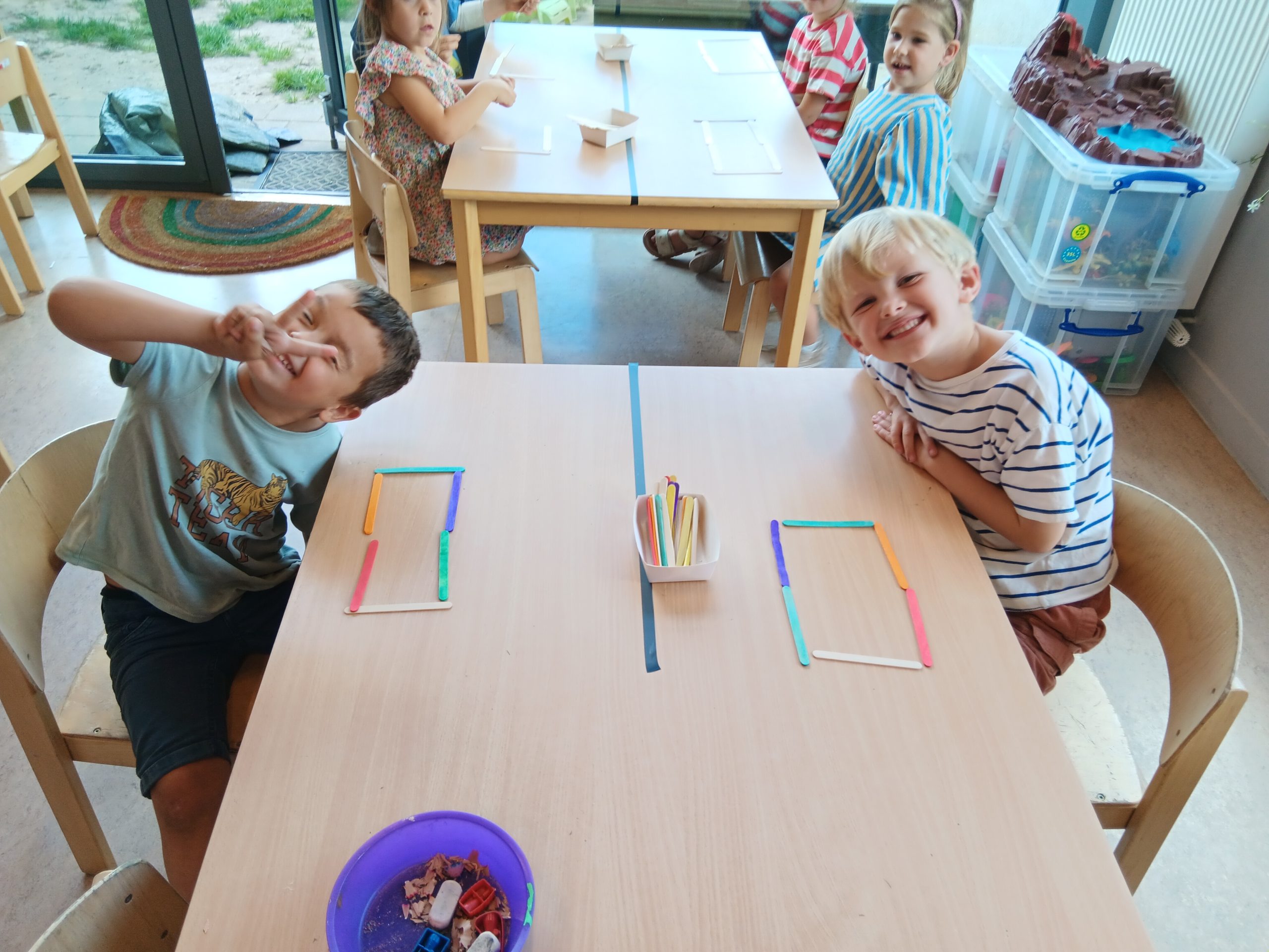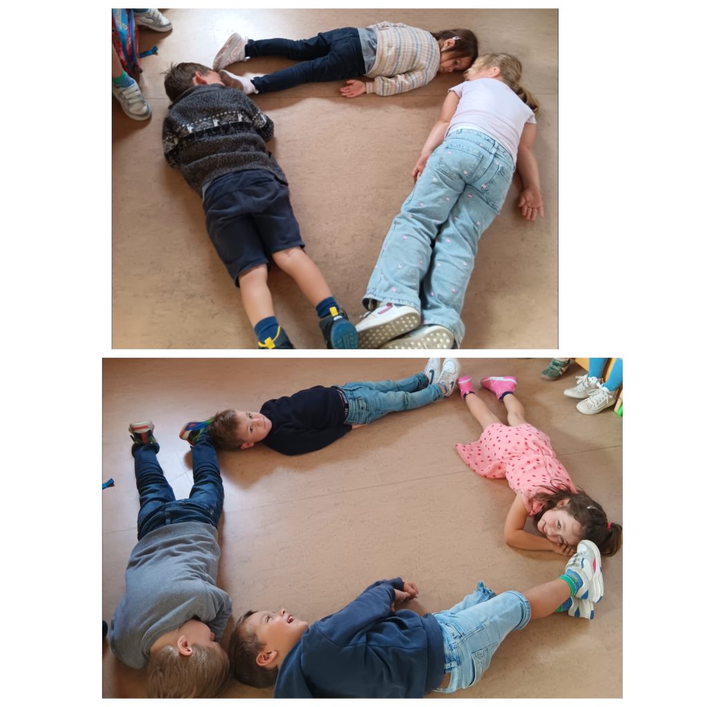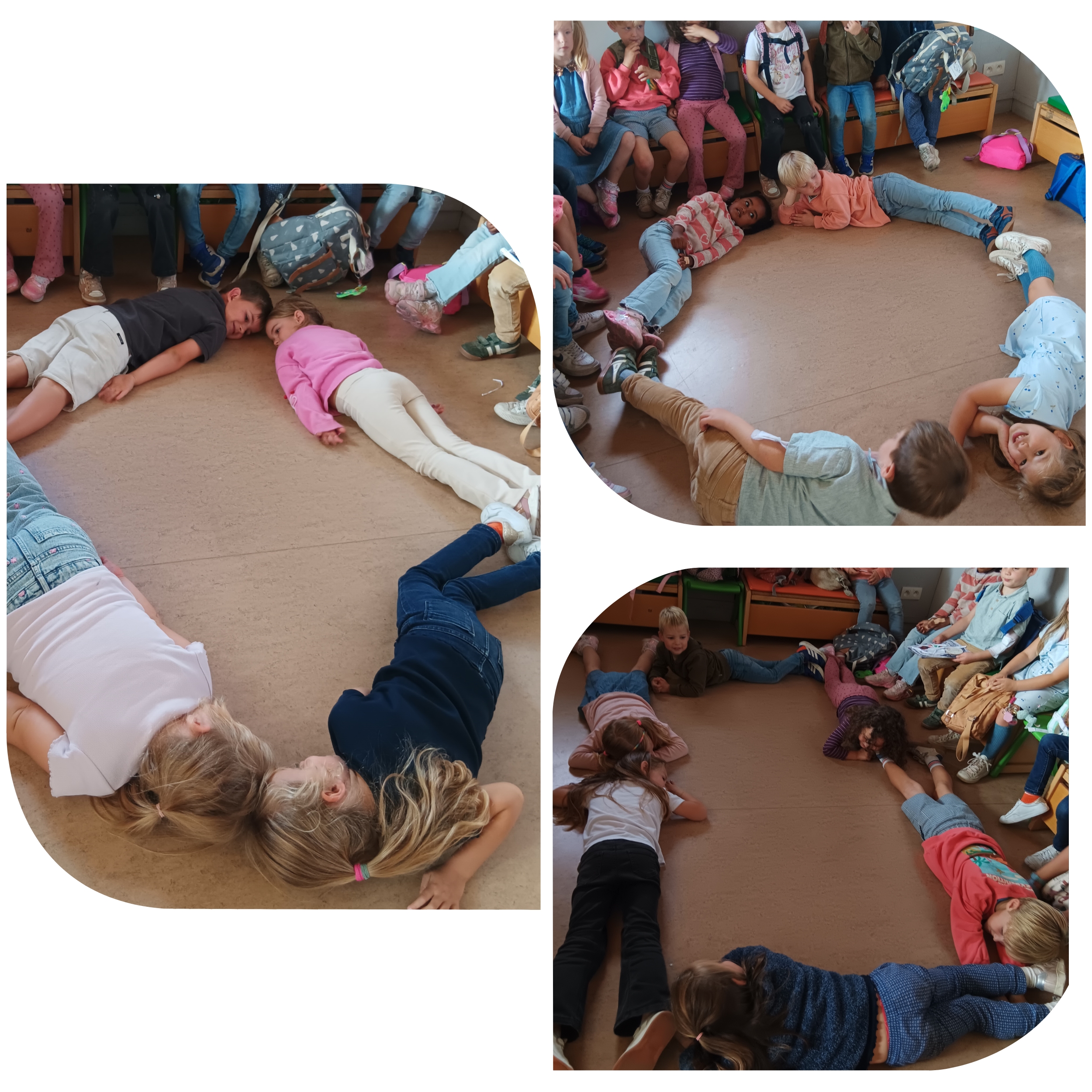Vandaag kregen de dino’s de opdracht om in groepjes een vorm te maken met hun eigen lichaam.