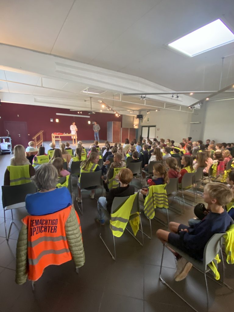 Op donderdagnamiddag fietsten de leerlingen van de derde graad samen naar de gemeentezaal in Wortegem. Daar genoten ze van een voorstelling rond EHBO. Het toneelstuk bracht eerste hulp op een grappige en luchtige manier, waardoor de leerlingen al spelenderwijs ontdekten hoe belangrijk het is om te weten wat te doen bij een noodsituatie. Een welgemeende dankjewel aan de vrijwilligers en de politie voor de veilige begeleiding onderweg.