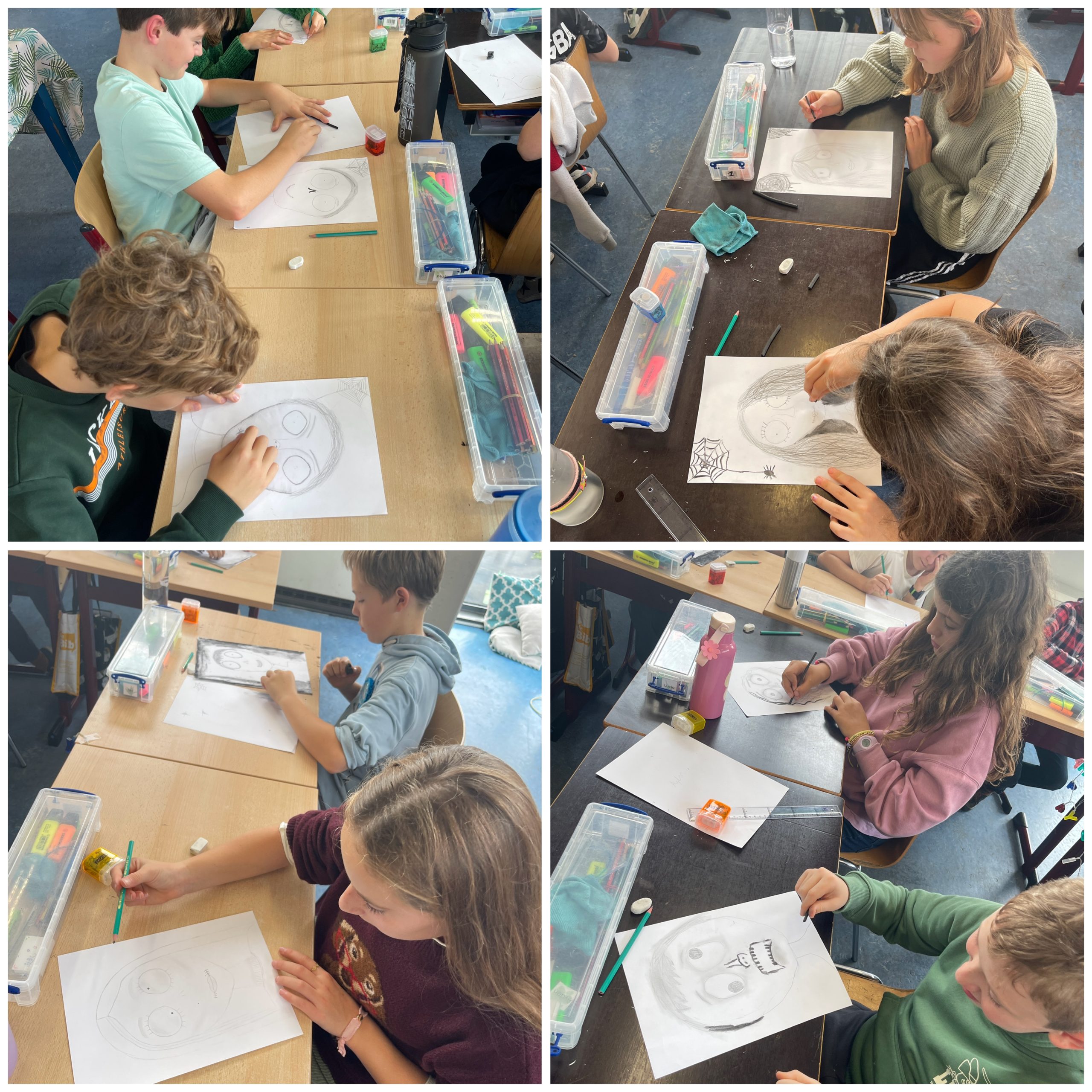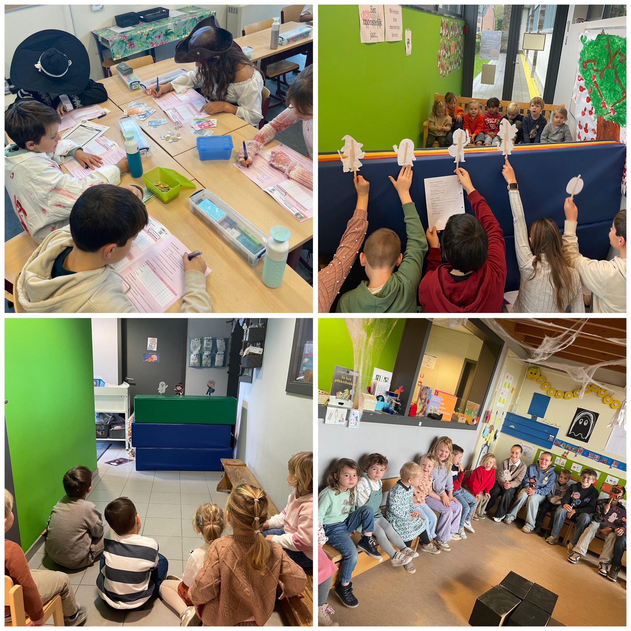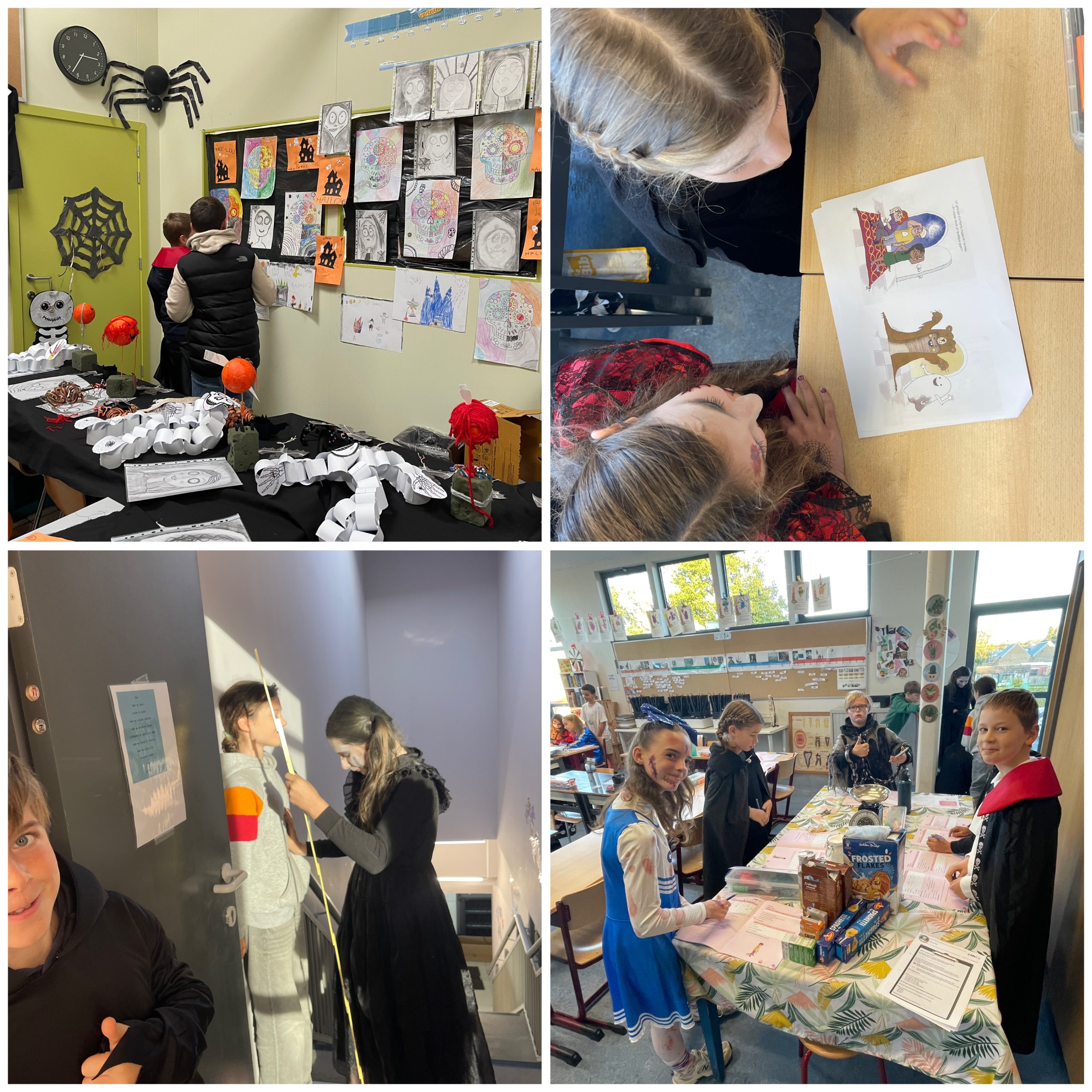 De laatste week voor de vakantie stond helemaal in het teken van Halloween. Een griezelig meetcircuit werd uitgevoerd, we maakten een zelfportret in de stijl van Tim Burton, brachten een bezoek aan het griezelmuseum, voerden een poppenspel op voor de kleutertjes en lazen tijdens de les Frans zelfs een boekje over ‘le fantôme Oscar’. Kijk maar eens… als je durft! 👻