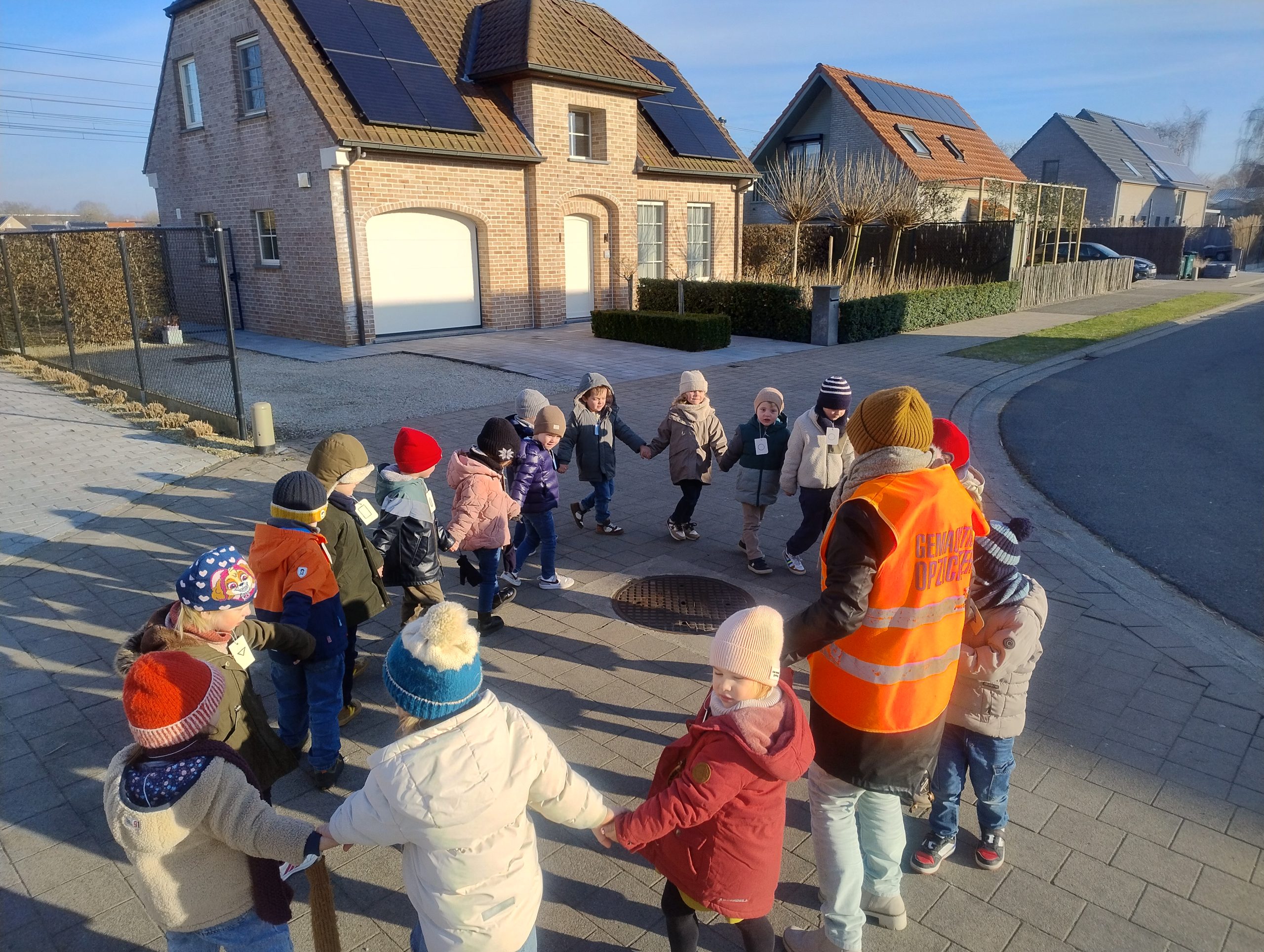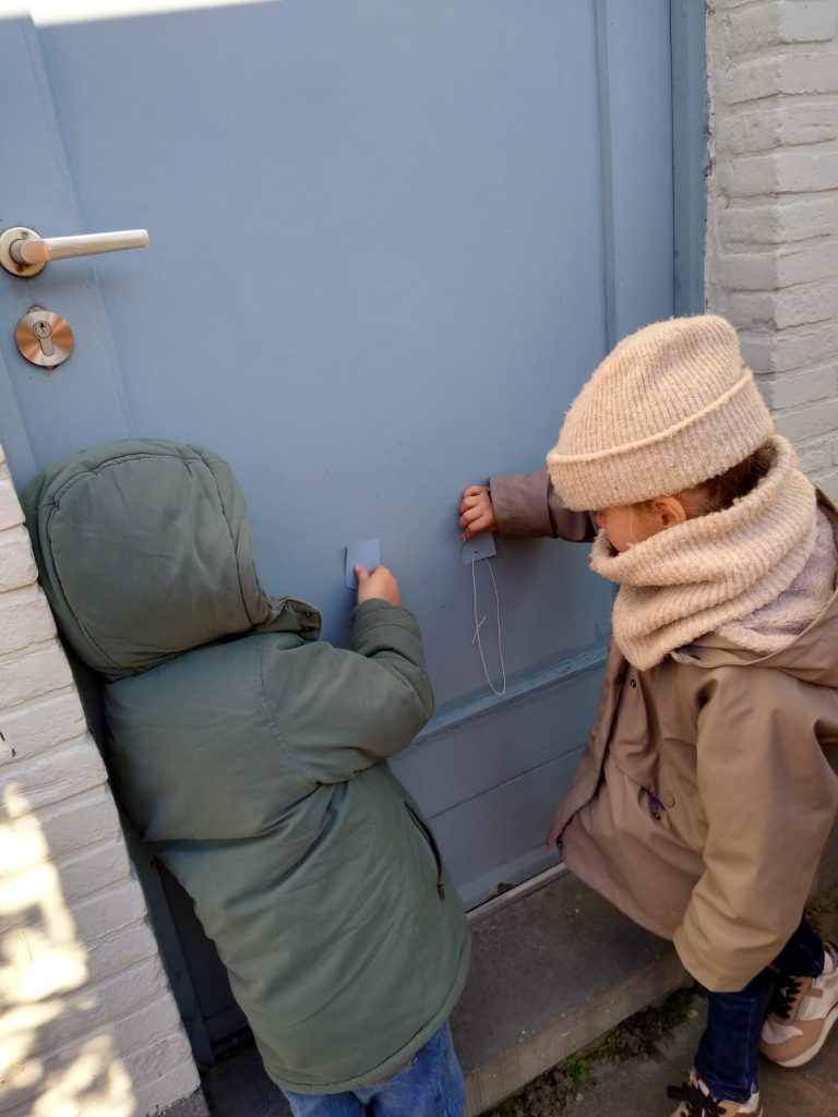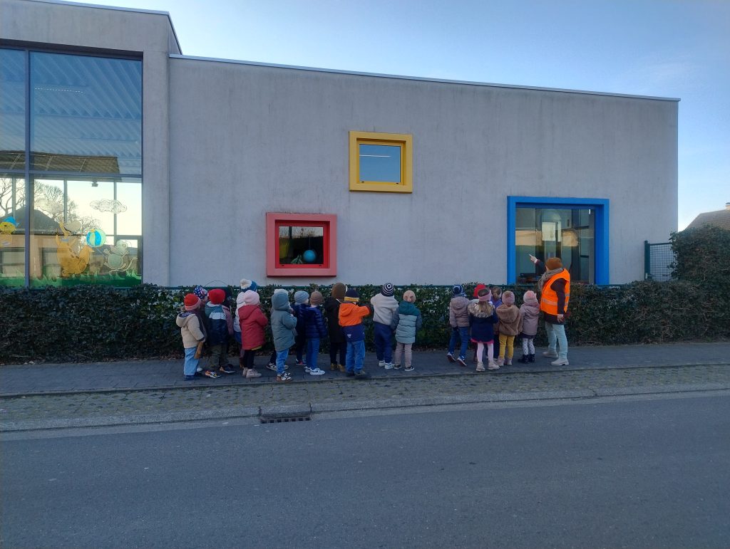 Ramen in verschillende kleuren, een putdeksel dat rond is, tegels die vier hoeken hebben, … Overal waar we komen, is ons nieuwe thema ‘ik zie een vorm, ik zie een kleur’ van toepassing. Met onze ‘zoek-kaartjes’ rond de hals gingen we op stap en zagen we heel wat geleerde vormen op school en langs de weg.