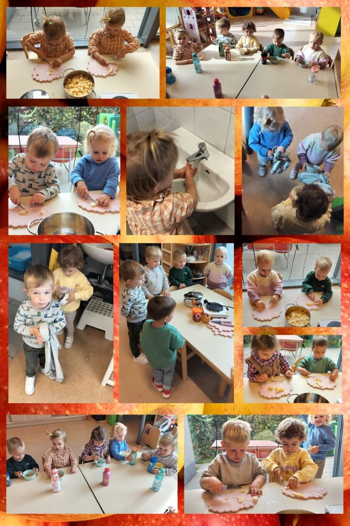 We maakten appelmoes in de klas. Eerst handen wassen natuurlijk. Daarna mochten de kleuters appels leren snijden om dan te koken tot heerlijke appelmoes. Daarna deden we natuurlijk ook samen de afwas!
