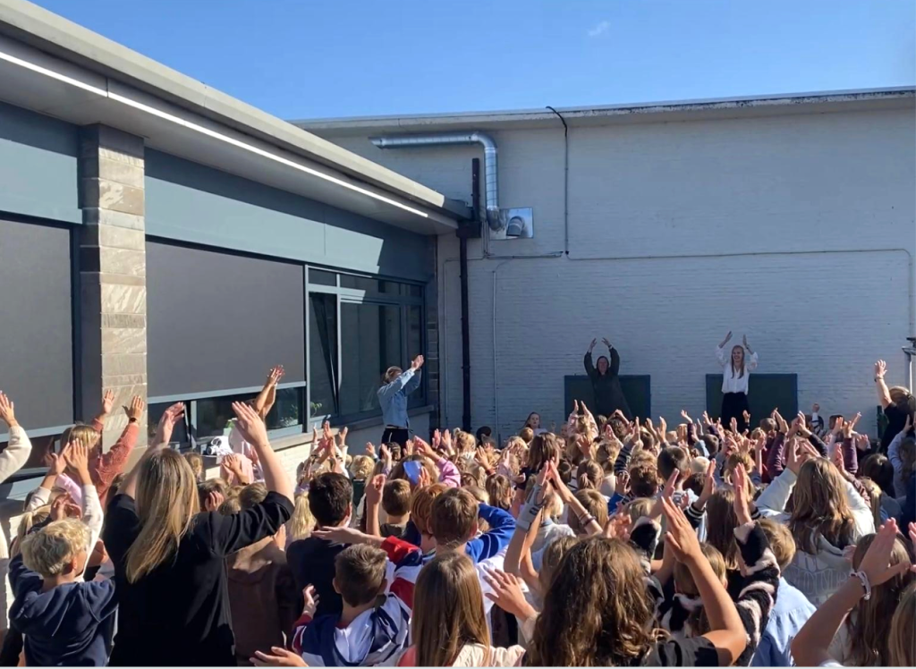“Ik, jij, hij of zij” is dit jaar ons jaarlied. Juf Ilse leerde ons een tof dansje aan, maar het is toch veel leuker als we dit met z’n allen SAMEN kunnen dansen! Dus kwamen we vorige week met alle kinderen en leerkrachten SAMEN want SAMEN dansen en zingen, dat is verbinden en werken aan het SAMEN STERK gevoel. Iedereen zong en bewoog enthousiast mee, dus kreeg iedereen het eerste taartpunt mee naar de klas!